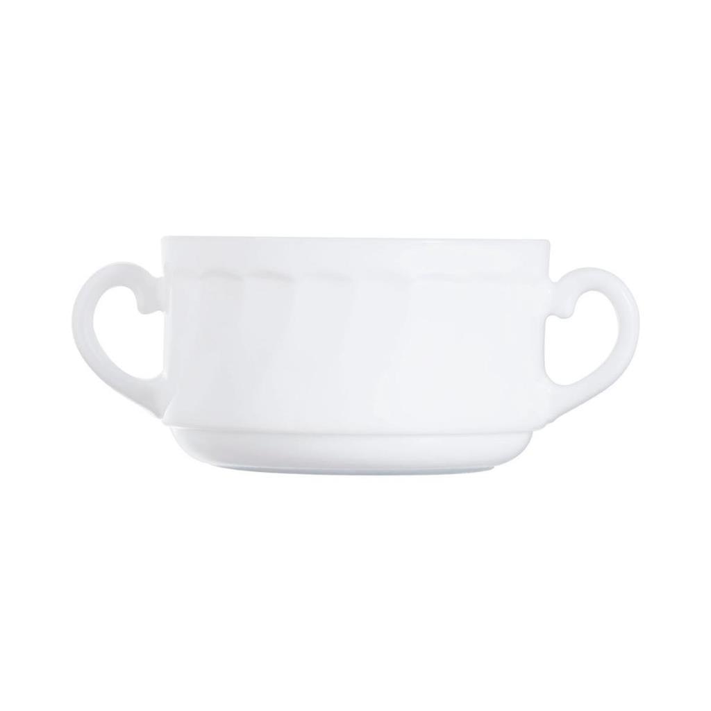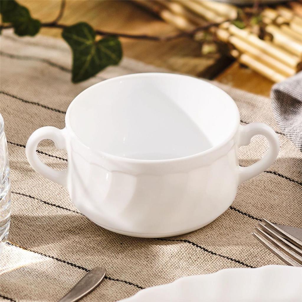 Skodela za juho z ročaji iz belega opalnega stekla, pakirana po 6kos v paket.