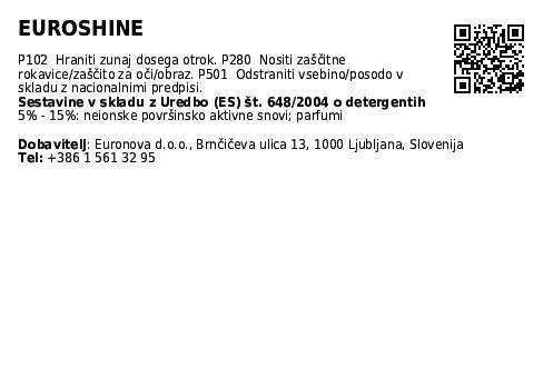 Euroshine je kislo izpiralno sredstvo za profesionalne stroje in konvomate, razvito za uporabo pri vseh trdotah vode. Vsebuje dodatke, ki pospešujejo proces sušenja posode, preprečujejo nastanek vodnega kamna v izpiralni coni ter dajejo odlične pralne učinke. Natančno doziranje pomivalnega sredstva ter aktivne sestavine omogočajo prihranek na času, vodi in energiji.