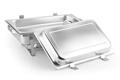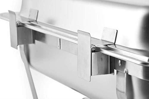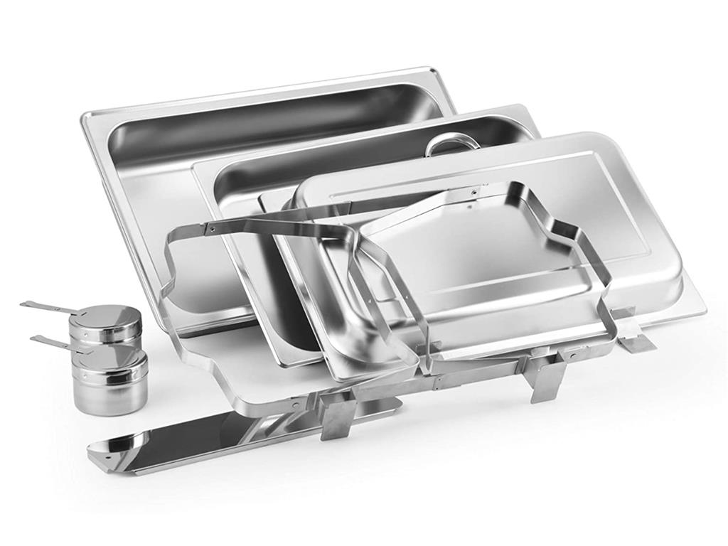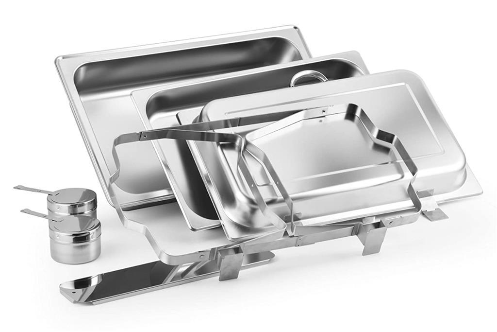 Chafing-Dish-Behälter für einfaches Servieren. Das Chafing-Dish-Set beinhaltet einen größeren Behälter, zwei Halter für Chafing-Dish-Geldosen und einen GN-Behälter der Größe 1/1 mit einer Tiefe von 65 mm. Dieser Chafing Dish verfügt über einen aufrollbaren Klappdeckel für ein einfacheres Aufsetzen des Deckels während des Servierens.