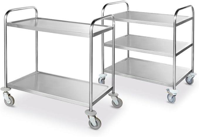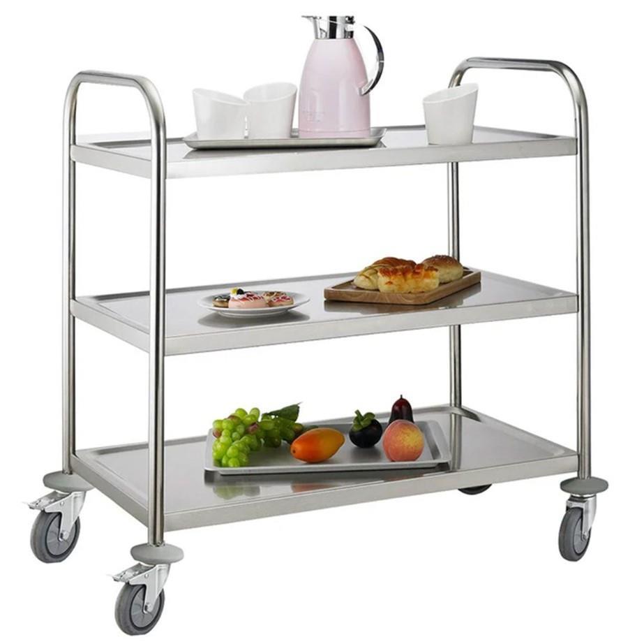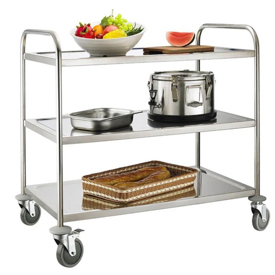 Servirni voziček iz izredno vzdržljivega nerjavečega jekla. Robustna izdelava bo omogočila dolgotrajno prevažanje hrane.