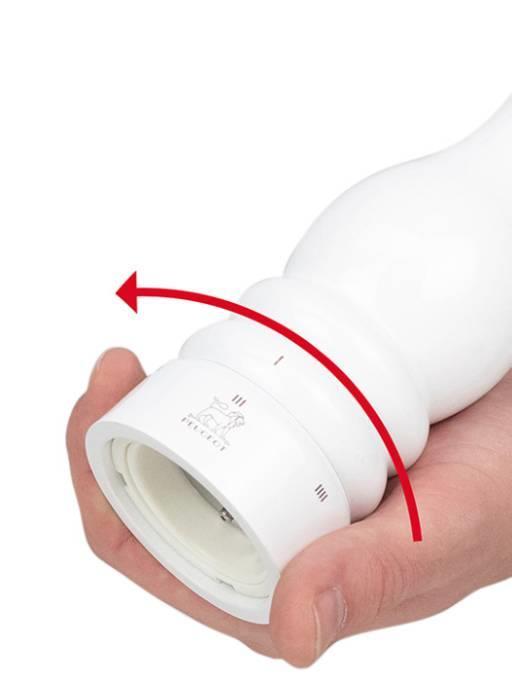Ta mlinček za sol, opremljen z ekskluzivnim sistemom Peugeot u’Select, ponuja 6 nastavitev na dnu za prilagoditev teksture vaše soli od soli v prahu do grobe, odvisno od osebnega okusa in potrebe vaše jedi.