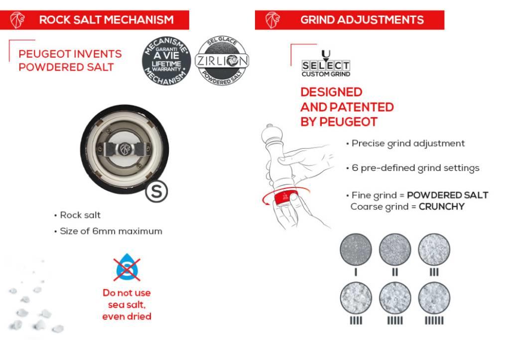Njegova velikost je odsev Peugeotovega znanja - velik in kompleten. S svetlim lesenim izgledom, je svetovno znana silhueta mlinčka za sol Paris prav odlična. Vrtljiv gumb na vrhu, z emblemom leva, služi enostavnemu prilagajanju grobosti mletja, mehanizem z doživljenjsko garancijo lahko sol zmelje grobo ali pa čisto fino. Vse kar še morate storiti sedaj, je ustvariti in poizkusiti jedi, začinjene z najbolj prefinjenimi mlinčki. Mlinček za sol Paris odlikuje tudi edinstven mehanizem za mletje, z doživljenjsko garancijo. Ta mlinček je pravi poklon čutom in okusom, na mizi, kot tudi v kuhinji.
