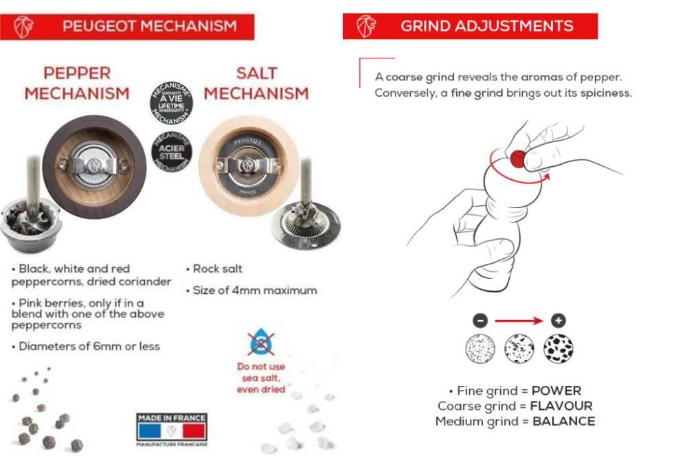Mlinčke Peugeot odlikujejo posebni mehanizmi, ki se brusijo samodejno. Peugeot je s svojimi mlinčki postal obvezna oprema vseh boljših kuhinj in gurmanskih kotičkov, saj poseben način mletja začimb omogoča optimalen izkoristek začimbe, ki jo meljemo ter v celoti ohranja njen vonj in okus.