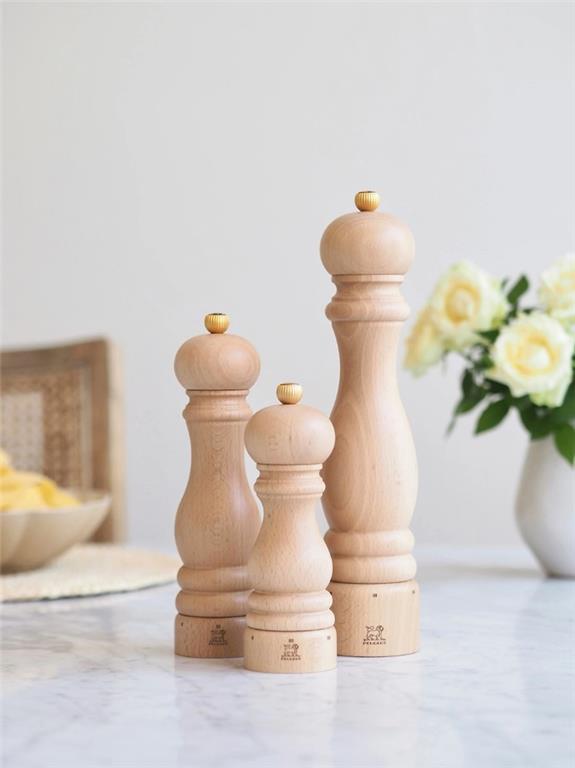 S svetlim lesenim izgledom, je svetovno znana silhueta mlinčka za sol Paris prav odlična. Vrtljiv gumb na vrhu, z emblemom leva, služi enostavnemu prilagajanju grobosti mletja, mehanizem z doživljenjsko garancijo lahko sol zmelje grobo ali pa čisto fino. Vse kar še morate storiti sedaj, je ustvariti in poizkusiti jedi, začinjene z najbolj prefinjenimi mlinčki. Mlinček za sol Paris odlikuje tudi edinstven mehanizem za mletje, z doživljenjsko garancijo. Ta mlinček je pravi poklon čutom in okusom, na mizi, kot tudi v kuhinji.