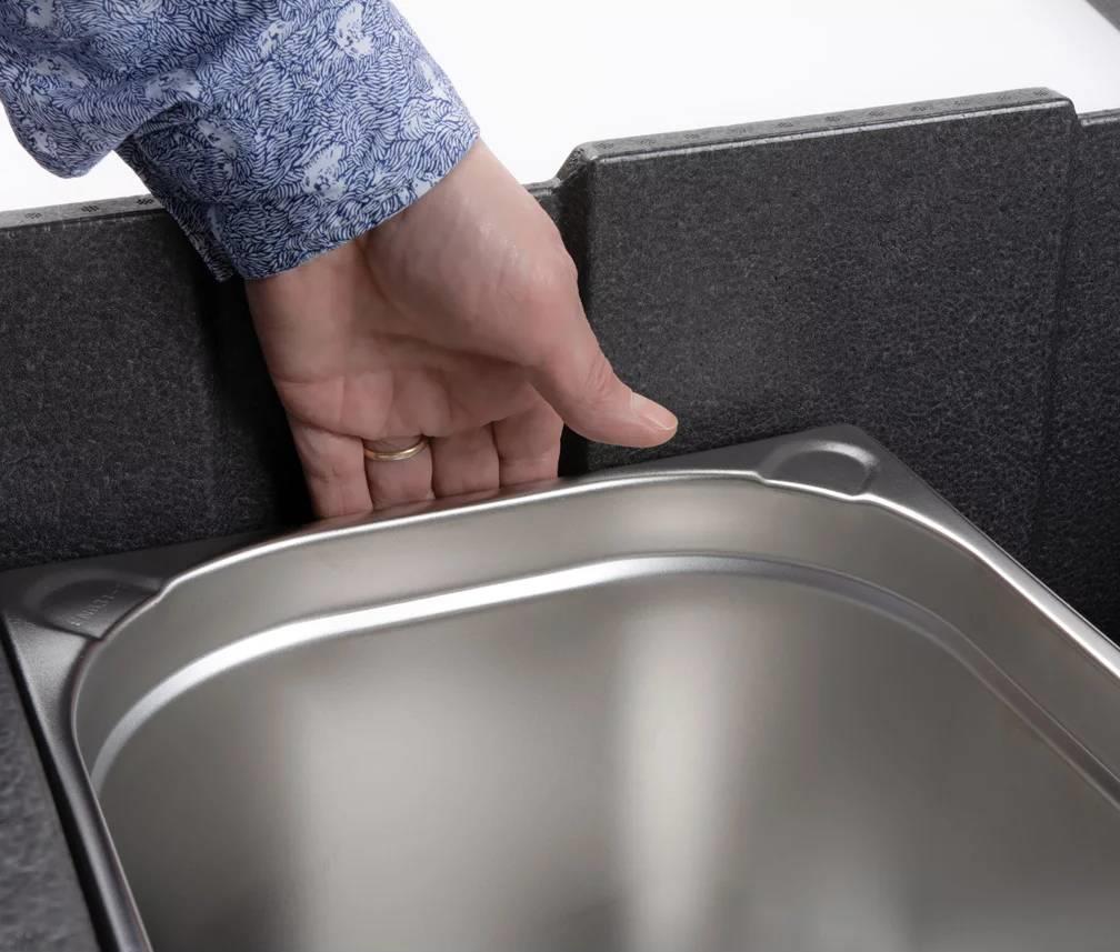 Ta termo škatla dimenzije GN 1/1 iz EPP je Premium PLUS različica termoboxa zunanje velikosti 60 x 40 cm s posebno vodoodporno, neprepustno notranjo površino. Površina ima visoko toplotno stabilnost od -40 do +120 °C, je primerna za pomivanje v pomivalnem stroju in izjemno robustna. Vdolbine na notranjih daljših straneh omogočajo enostavno odstranjevanje vročih ali težkih posod GN. Ergonomske vdolbine ročaja, tesno prilegajoč se pokrov in zunanja označevalna polja za sistem etiket omogočajo številne različne uporabe. Škatlo je mogoče kombinirati z drugimi dodatki, kot sta hladilni nastavek ali hladilni pokrov.