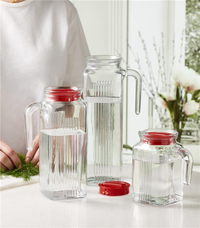 Stekleni vrč s pokrovom, za vodo sok in alkoholne pijače, inovativne oblike in kvalitetne izdelave iz debelejšega stekla, linije Frigo, bo poskrbel, da bo vaša postrežba izstopala.