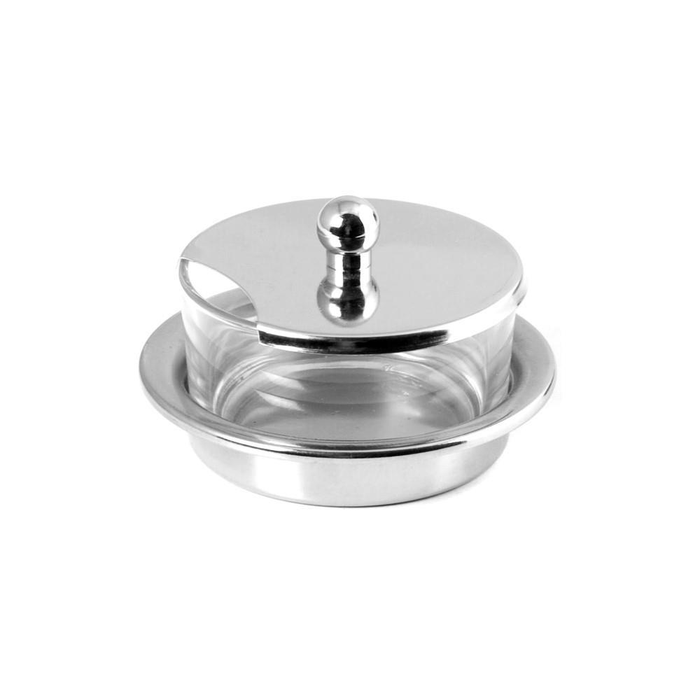 Posodica za serviranje parmezana pri mizi, iz stekla in ohišja iz nerjavečega jekla.