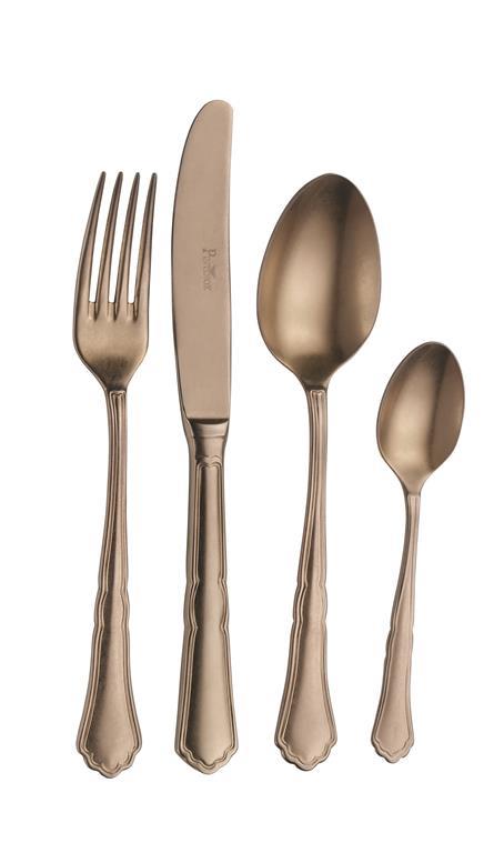 Jedilni pribor linije Settecento Stone Washed je obdelan tako, da ustvari vintage učinek na nerjavečem jeklu in namerno ustvari neenakomeren videz; vsak kos je torej edinstven. Namen je ponuditi kakovosten jedilni pribor, ki hkrati ustvarja retro vzdušje. Jedilni pribor linije Settecento, proizvedene iz kvalitetnega 18/10 nerjavečega jekla (18% kroma / 10% niklja). Zaradi sestave z visoko vsebnostjo kroma ima takšen pribor večjo trdnost, vzdržljivost in odpornost na rjavenje, visoka vsebnost niklja pa mu daje izredno visok sijaj.