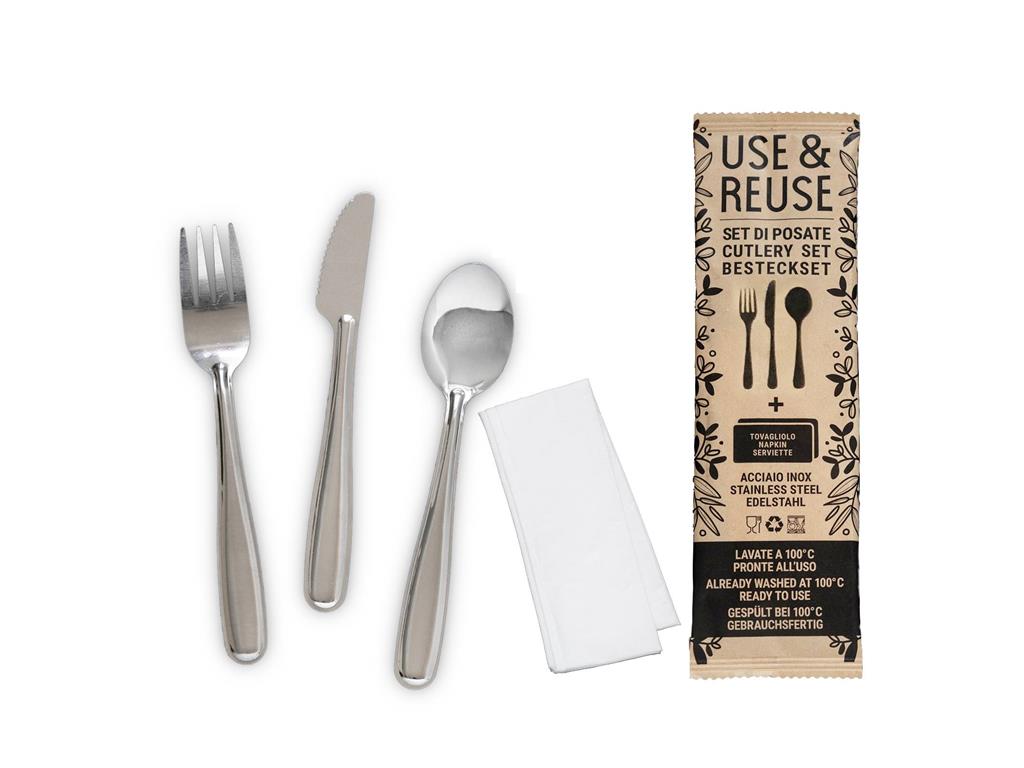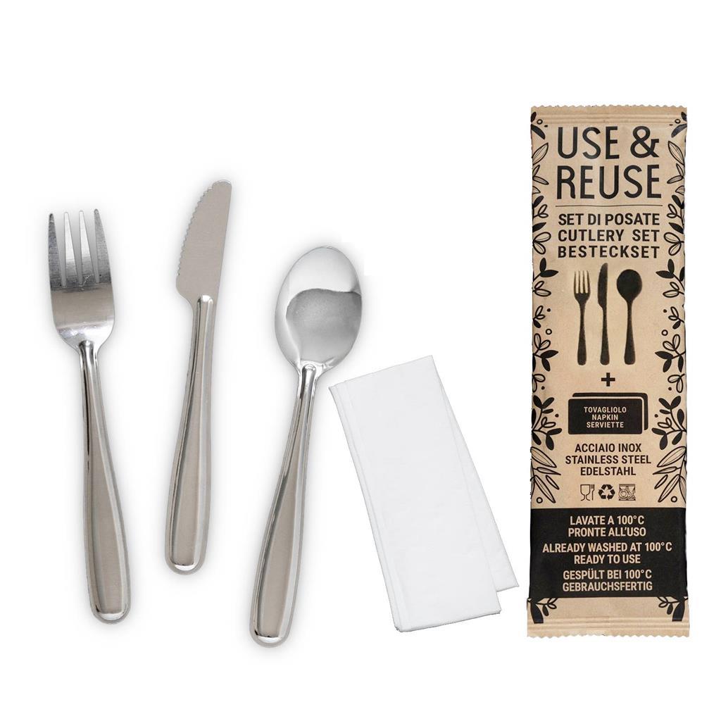 Set jedilnega pribora za večkratno uporabo, pripravljen za takojšnjo uporabo, higiensko zapakiran v set 3/1 - Vilica, nož, žlica in serveta