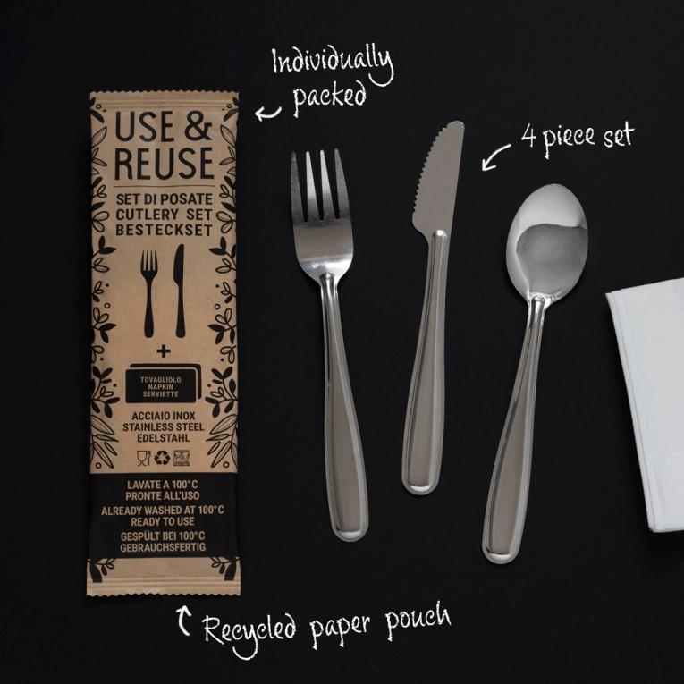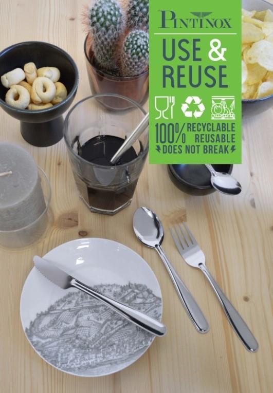 Novost v svetu gastronomije. Jedilni pribor in pripomočki za večkratno uporabo znamke USE&REUSE proizvajalca Pinti, so namenjeni vsem, ki potrebujejo večje količine cenovno ugodnega pribora, a hkrati ne želijo okolja obremenjevati s plastiko in ostalimi produkti za enkratno uporabo. Izdelki znamke USE&REUSE so narejeni iz kvalitetnega 18/10 nerjavečega jekla, njihova kvalitetna izdelava pa nam omogoča da jih v njihovem življenskem ciklu uporabimo mnogokrat in s tem pripomoremo pri ohranjanju okolja - se ne lomijo in obrabljajo kot izdelki za enkratno uporabo