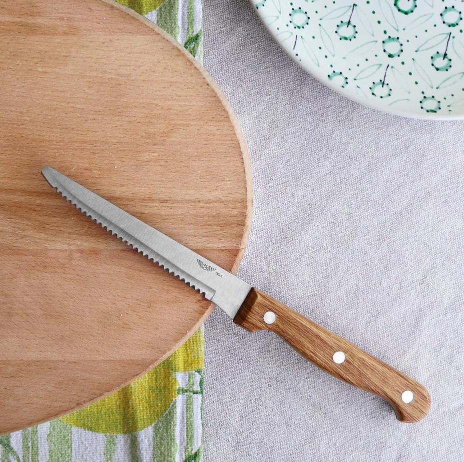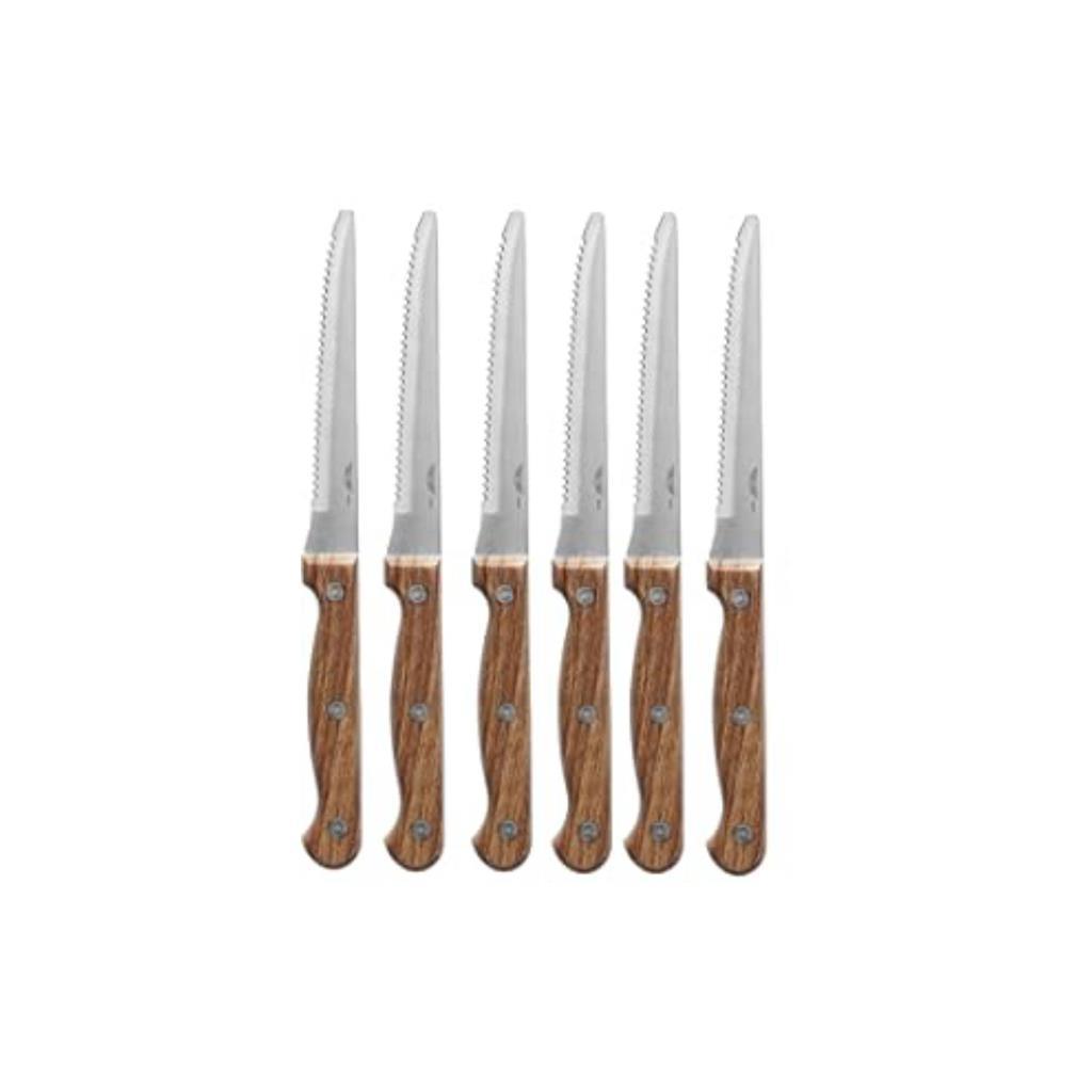 Nož z ročajem v izgledu lesa, pakiran v set po 6kos, dolžine 22cm in primeren za pranje v pomivalnem stroju, bo popolna izbira za rezanje zrezkov, pice in podobnih jedi.