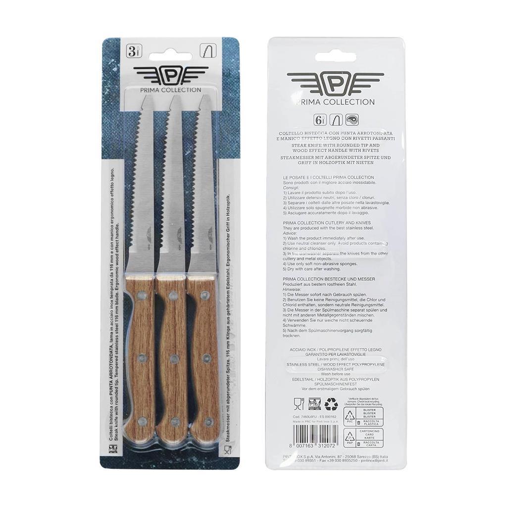 Serija namiznih nožev PINTI PRIMA je izdelana iz kovanega, kaljenega nerjavečega jekla AISI 420, ki ga odlikuje visoka trdota in dolga življenjska doba zaradi odlične odpornosti proti rji, koroziji in obrabi. Rezilo obdaja ročaj Pakkawood, ki je pritrjen z zakovicami iz nerjavečega jekla AISI 430.