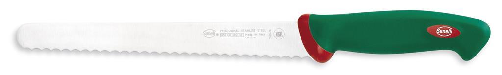 Nož za kruh in pekovske izdelke iz linije Premana professional s posebnim, srednje-gibljivim rezilom je primeren za rezanje kruha, pizze, tort in podobnih pekovskih izdelkov. Rezilo Sanelli nožev je proizvedeno iz visokokvalitetnega X50 CR MO 14 ali X60 CR MO V 14 nerjavečega jekla, izredno visoko postavljen standard, ki zagotavlja dolgotrajno življenjsko dobo rezila. Ročaji Sanelli nožev so proizvedeni s prav posebno tehnologijo Biomaster. Gre za trajno antibakterijsko zaščito, ki deluje na osnovi srebrovih ionov, preprečuje rast in razmnoževanje bakterijam in s tem zagotavlja 24/7 higieno, hkrati pa ostaja nezaznavna za uporabnika in snovi, s katerimi prihaja v stik..