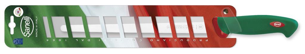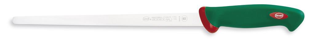 Nož za pršut in lososa iz linije Premana professional s posebnim, gibljivim rezilom je primeren za rezanje rezin pršuta in lososa. Rezilo Sanelli nožev je proizvedeno iz visokokvalitetnega X50 CR MO 14 ali X60 CR MO V 14 nerjavečega jekla, izredno visoko postavljen standard, ki zagotavlja dolgotrajno življenjsko dobo rezila. Ročaji Sanelli nožev so proizvedeni s prav posebno tehnologijo Biomaster. Gre za trajno antibakterijsko zaščito, ki deluje na osnovi srebrovih ionov, preprečuje rast in razmnoževanje bakterijam in s tem zagotavlja 24/7 higieno, hkrati pa ostaja nezaznavna za uporabnika in snovi, s katerimi prihaja v stik..