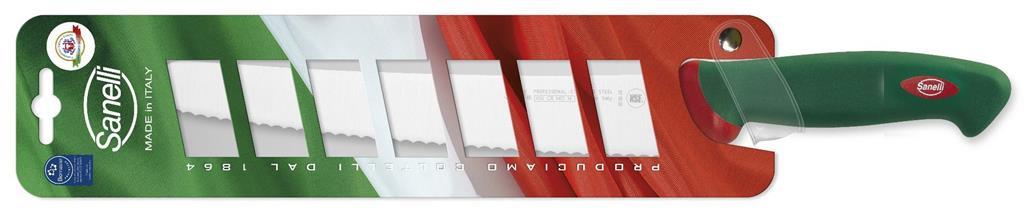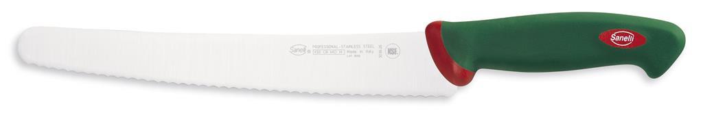 Slaščičarski nož za pekovske izdelke iz linije Premana professional s posebnim, srednje-gibljivim rezilom je primeren za rezanje kruha, pizze, tort in podobnih pekovskih izdelkov. Rezilo Sanelli nožev je proizvedeno iz visokokvalitetnega X50 CR MO 14 ali X60 CR MO V 14 nerjavečega jekla, izredno visoko postavljen standard, ki zagotavlja dolgotrajno življenjsko dobo rezila. Ročaji Sanelli nožev so proizvedeni s prav posebno tehnologijo Biomaster. Gre za trajno antibakterijsko zaščito, ki deluje na osnovi srebrovih ionov, preprečuje rast in razmnoževanje bakterijam in s tem zagotavlja 24/7 higieno, hkrati pa ostaja nezaznavna za uporabnika in snovi, s katerimi prihaja v stik..
