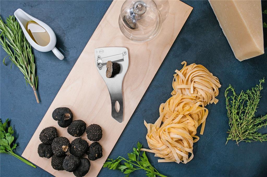 Vzdržljiv rezalnik za tartufe iz nerjavečega jekla s satenasto obdelavo z rezilom gladkim kot britev iz nerjavečega jekla za čisto rezanje, z natančnim regulatorjem za enostavnejše rezanje, ki omogoča vsakič tanke rezine enake debeline. Idealen za tartufe, gobe, zelenjavo, parmezan in čokolado.