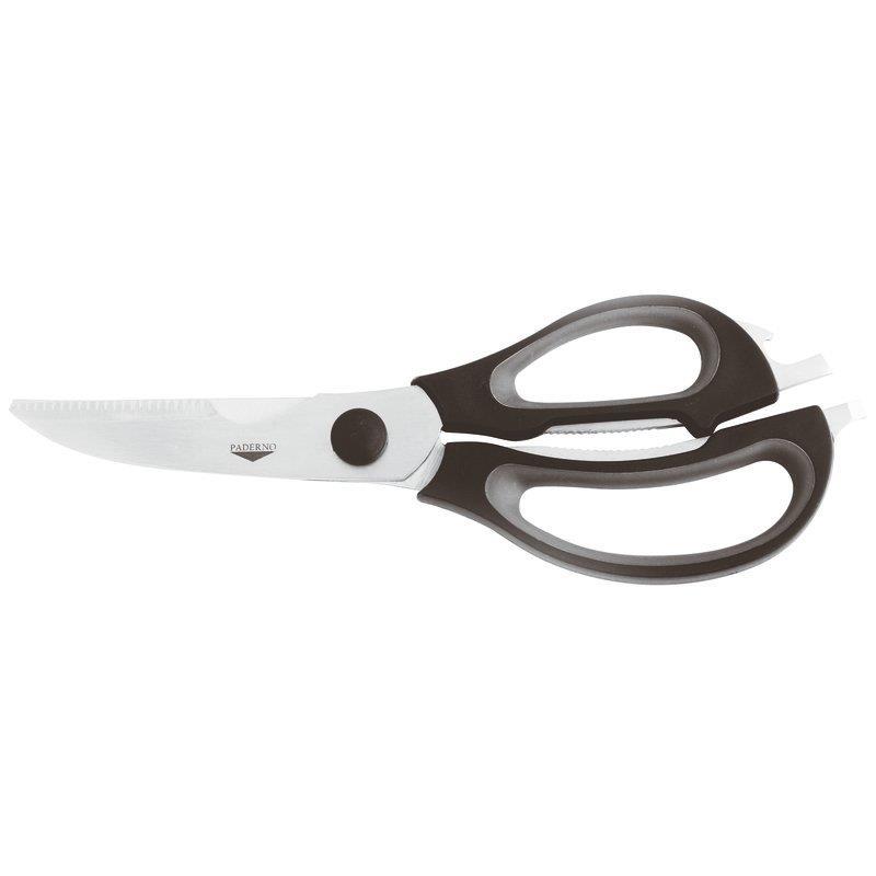 Trpežne kuhinjske škarje iz nerjavečega jekla z ergonomskim ročajem iz plastike.