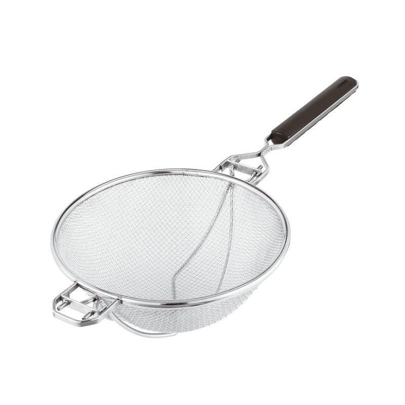 Gosto cedilo z dvojno mrežico za fino precejanje. Z dodatnimi ojačitvami je cedilo kos tudi težki hrani.
