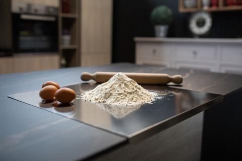 Plošča za oblikovanje testa za pizzo iz nerjavečega jekla poskrbi, da ob pripravi testa pult kuhinje ne bo umazan ter se testo ne bo prijemalo nanj.