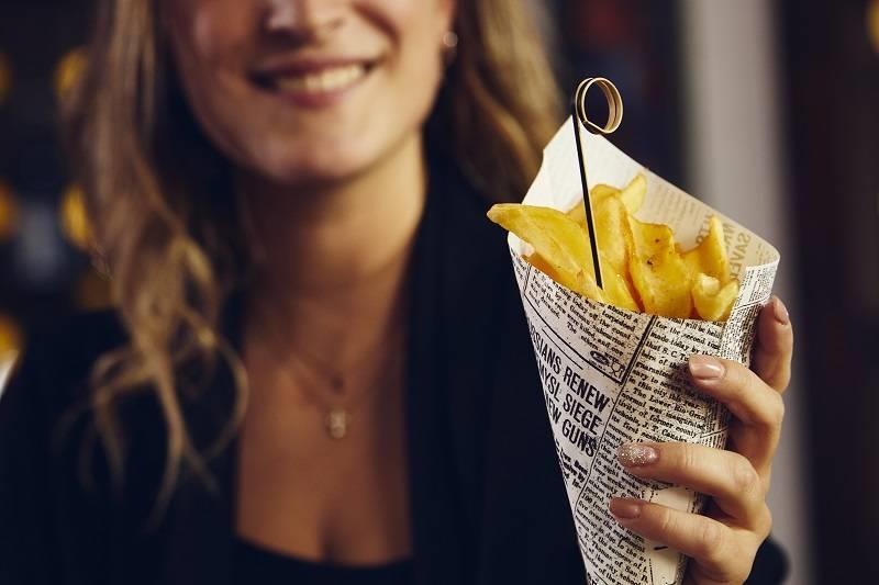 Vrečke za krompirček iz maščobno odbojnega papirja, dimenzije 29x21cm. Za lažji prenos hrane, prilog, krompirčka ter drugih podobnih jedi, s potiskom časopisa.