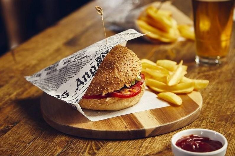 Burger vrečke iz maščobo odbojnega papirja, dimenzije 14x13cm. Za lažji prenos burgerjev, sendvičev ter drugih podobno velikih jedi, s potiskom časopisa.
