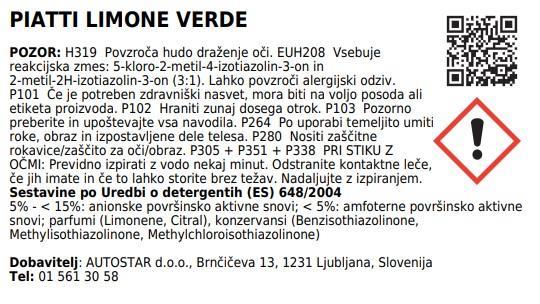 Detergent za ročno pomivanje posode z vonjem zelene limone. Vsebuje nežno formulo z nevtralno vrednostjo pH, ki razmaščuje in odstranjuje neprijetne vonjave.