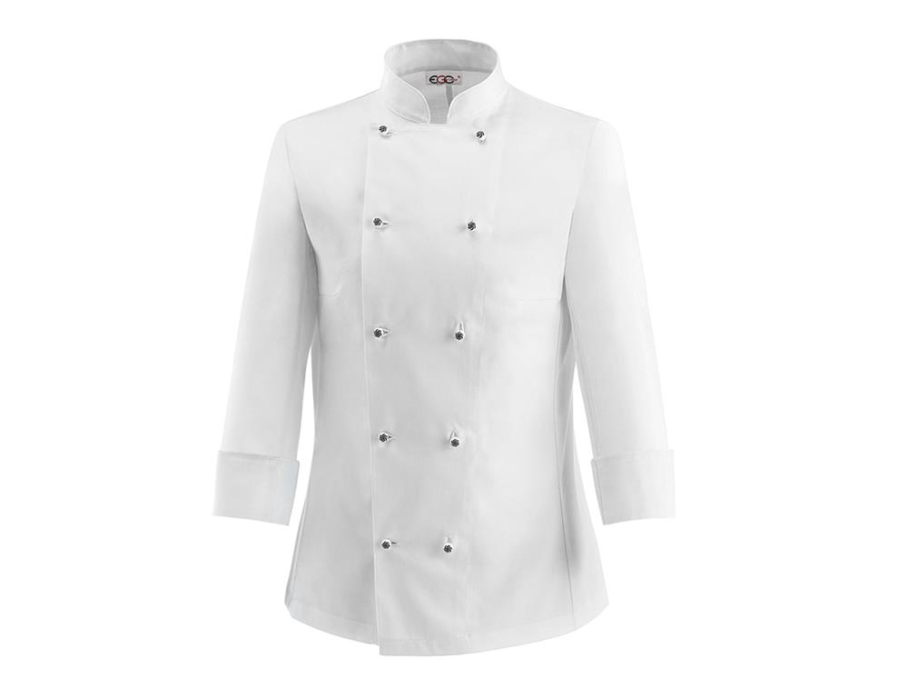 Kuharski jopič v beli barvi linije Lady z dolgimi rokavi ter z dvema vrstama gumbov za obojestransko zapenjanje. Linija Lady je proizvedena iz 100% bombaža, kar ji zagotavlja dolgotrajno vzdržljivost in možnost intenzivnejšega čiščenja.