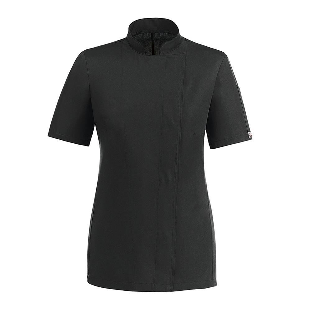 Kuharski jopič linije Woman Easy s kratkimi rokavi, v črni barvi, z gumbi na pritisk za hitrejše zapenjanje in odpenjanje ter inovativno tehnologijo Air plus za ohranjanje hladnejše hrbtne strani. Linija Woman Easy je proizvedena iz novega, inovativnega materiala, 100% Micro-fibra, ki je enostavna za vzdrževanje in prijetna ter lahkotna za nošenje.