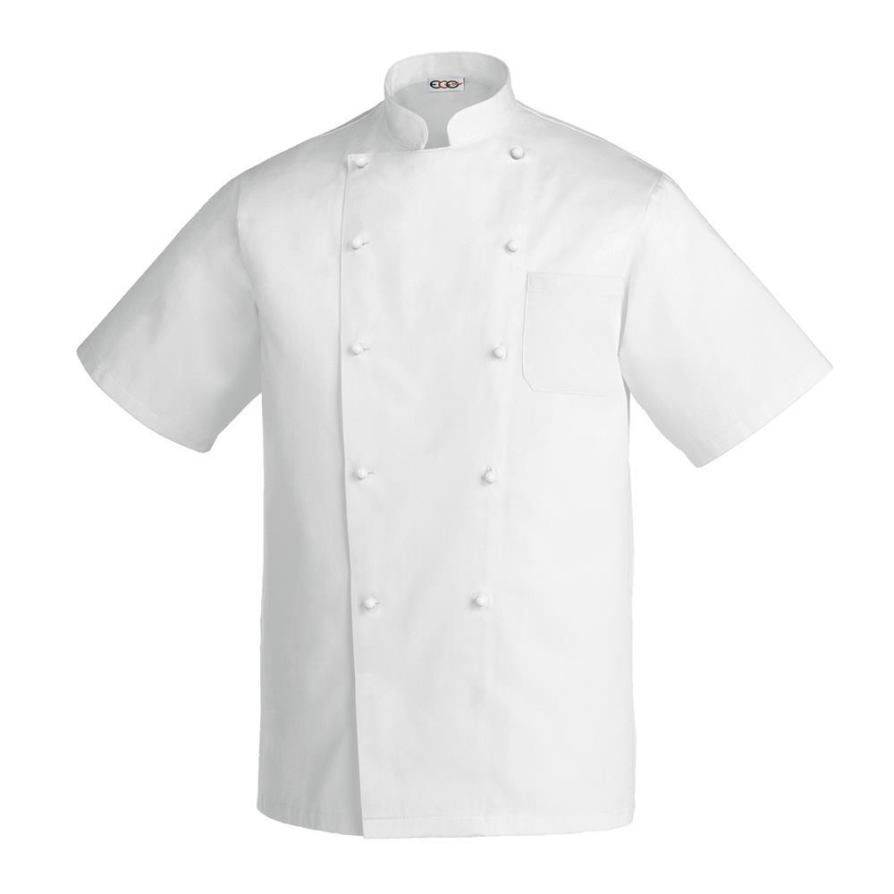 Kuharski jopič linije Rex s kratkimi rokavi, z dvema vrstama gumbov za obojestransko zapenjanje. Linija Rex je proizvedena iz 100% bombaža, kar ji zagotavlja dolgotrajno vzdržljivost in možnost intenzivnejšega čiščenja.