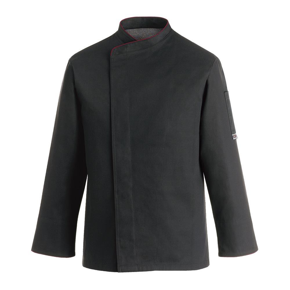 Kuharski jopič linije Comfort v črni barvi z gumbi na pritisk za hitrejše zapenjanje in odpenjanje ter inovativno tehnologijo Air plus za ohranjanje hladnejše hrbtne strani. Linija Comfort je proizvedena iz optimalne mešanice poliestra (65%) in bombaža (35%), razmerje, ki bo zagotavljalo dolgotrajno vzdržljivost a hkrati prijetnejši občutek ob nošenju ter lahkotnost.