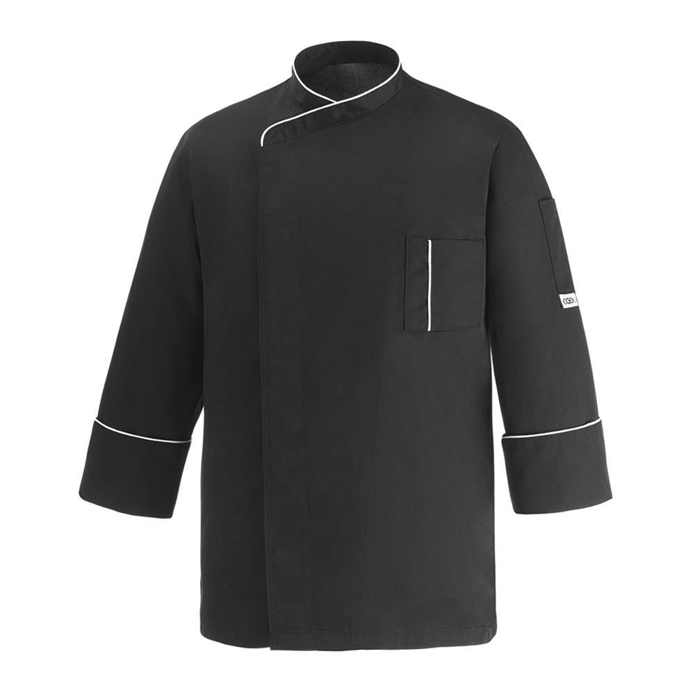 Kuharski jopič linije Cesare v črni barvi z gumbi na pritisk za hitrejše zapenjanje in odpenjanje ter inovativno tehnologijo Air plus za ohranjanje hladnejše hrbtne strani. Linija Cesare je proizvedena iz novega, inovativnega materiala, 100% Micro-fibra, ki je enostavna za vzdrževanje in prijetna ter lahkotna za nošenje.