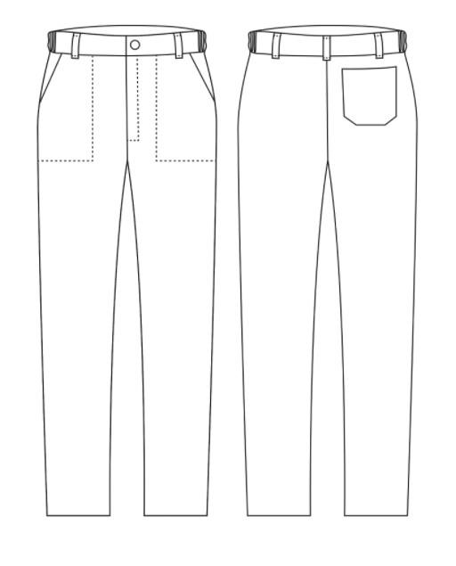 Črne kariraste kuharske hlače brez elastike, primerne za nošenje s pasom, z všitima žepoma in žepom na zadnji strani.