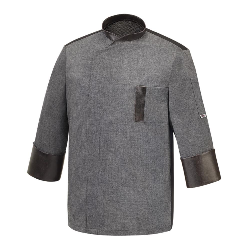 Kuharski jopič linije Jocker v sivi barvi in rjavimi vstavki iz eko usnja. Kuharski jopič ima gumbe na pritisk ter inovativno tehnologijo Air plus za ohranjanje hladnejše hrbtne strani. Linija Jocker je proizvedena iz optimalne mešanice poliestra (65%) in bombaža (35%), razmerje, ki bo zagotavljalo dolgotrajno vzdržljivost a hkrati prijetnejši občutek ob nošenju ter lahkotnost.
