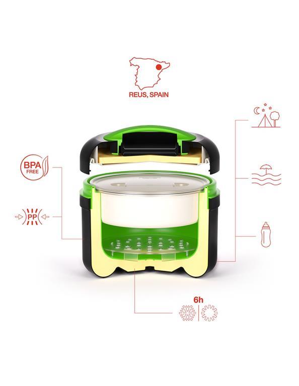 Idealna rešitev za prenos hrane, ko želimo, da le-ta obdrži svojo prvotno temperaturo. Termo posoda za prenos živil, obdana z na udarce odporno inzulacijsko peno. Ohrani temperaturo vsebine do 6ur (vroče in mrzlo). Primerna tudi za shranjevanje ledu v pultu. Vsaka posoda vsebuje še eno posodico in mrežo.