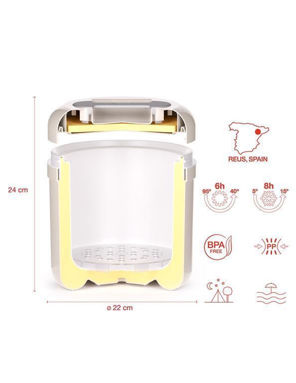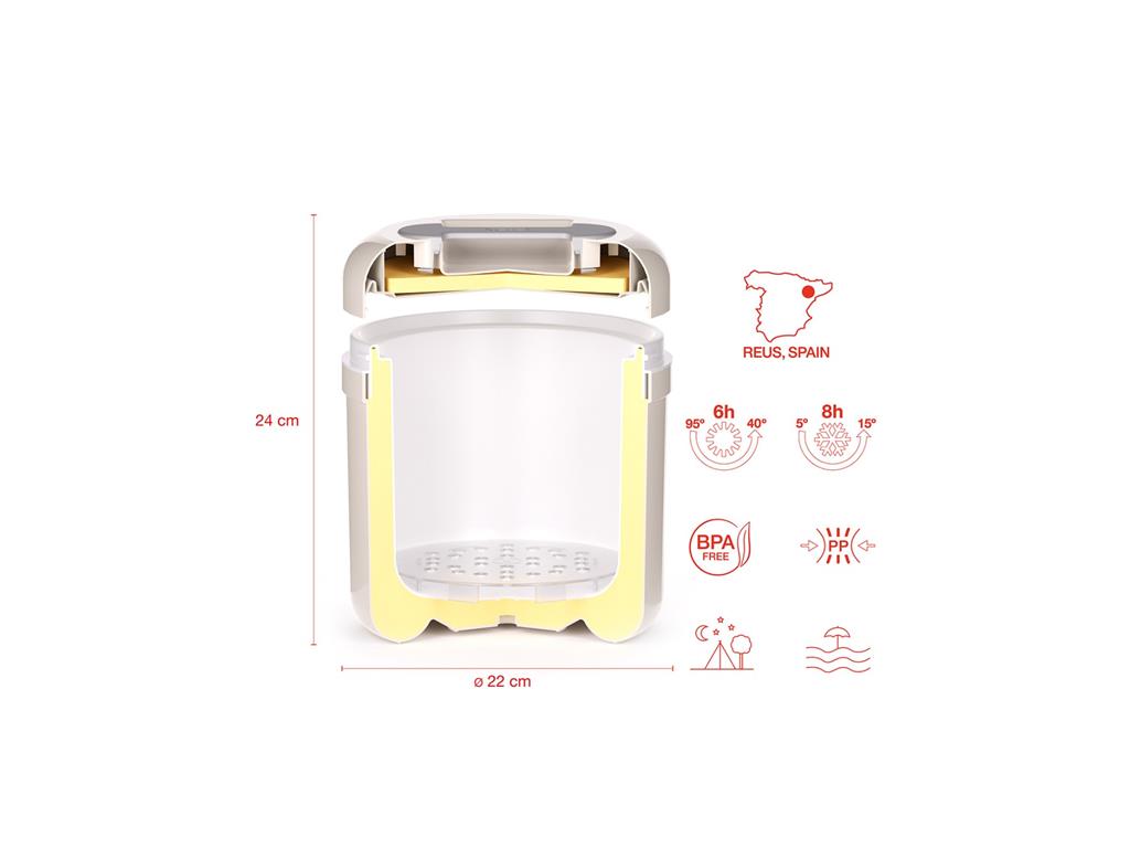 Idealna rešitev za prenos hrane, ko želimo, da le-ta obdrži svojo prvotno temperaturo. Termo posoda za prenos živil, obdana z na udarce odporno inzulacijsko peno. Ohrani temperaturo vsebine do 6ur (vroče in mrzlo). Primerna tudi za shranjevanje ledu v pultu. Vsaka posoda vsebuje še eno posodico in mrežo.