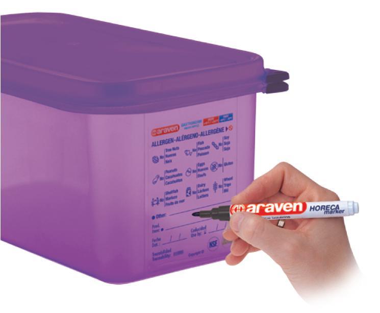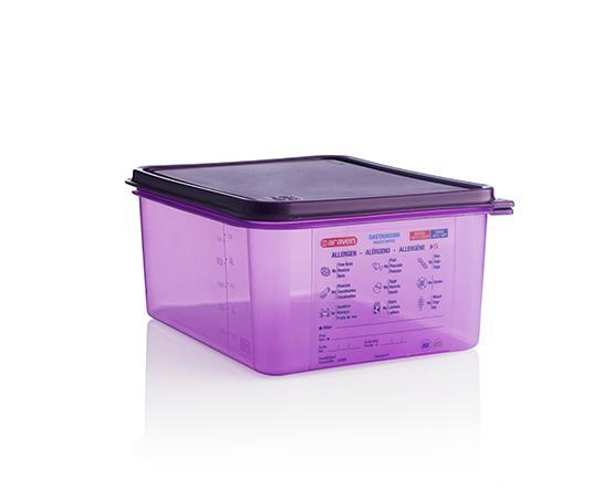 Der violette Behälter zur Aufbewahrung von Lebensmitteln unterscheidet sich optisch stärker von anderen Behältern in der Küche und ermöglicht so die strikt getrennte Aufbewahrung von Lebensmitteln, die nicht mit Allergenen in Berührung kommen dürfen. Zusammen mit dem beigefügten Deckel ermöglicht der Frischhaltebehälter einen hermetischen Verschluss und verlängert so die Frische der aufbewahrten Lebensmittel (bis zu 25 %). Trotz des dichten Verschlusses lassen sich die Deckel dank des speziell entwickelten Griffs am Deckel leicht öffnen.