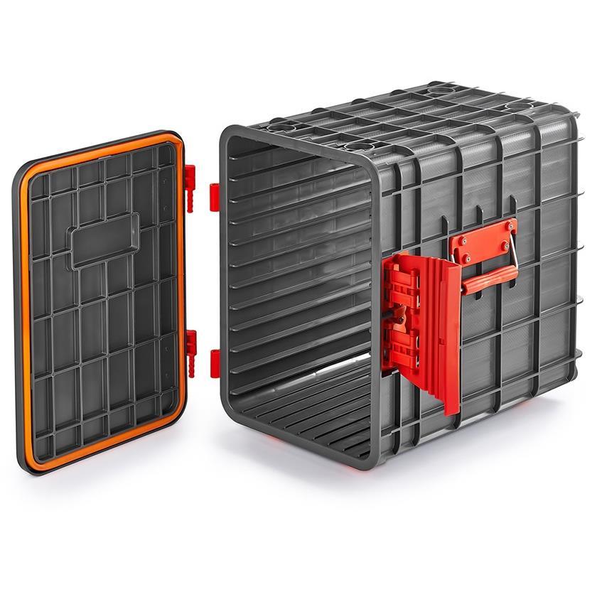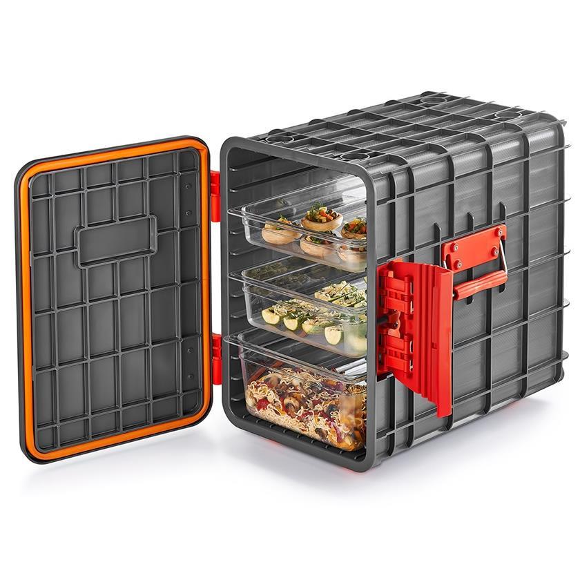 Transportni kovček iz izredno trpežnega in vzdržljivega materiala vam omogoča, da hrana in pijača lažje prispeta na svoj cilj ter vam s tem omogoča popolno postrežbo. Zapirala narejena iz kvalitetnega polyamida. Ergonomsko oblikovani in izredno kvalitetni ročaji omogočajo enostavno prenašanje. Primerno za stabilno nalaganje eden na drugega. Pralno v pomivalnem stroju. Iz materiala, primernega za enostavno recikliranje (ABS plastika). Popolnoma odstranljiva sprednja vratca.