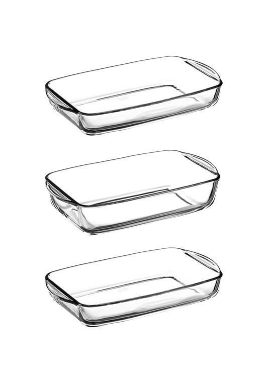 Set steklenih pekačev, iz naravno neprijemajočega stekla, za uporabo v pečici in pri visokih temperaturah iz linije Borcam. S prostorninami 1.3L-1.95L-2.75L bodo ti Borcam pekači primerni tudi za pripravo večjih jedi, kvalitetna izdelava pa bo poskrbela, da je primeren za uporabo v pečici.