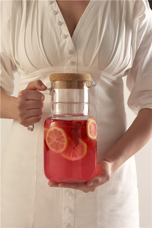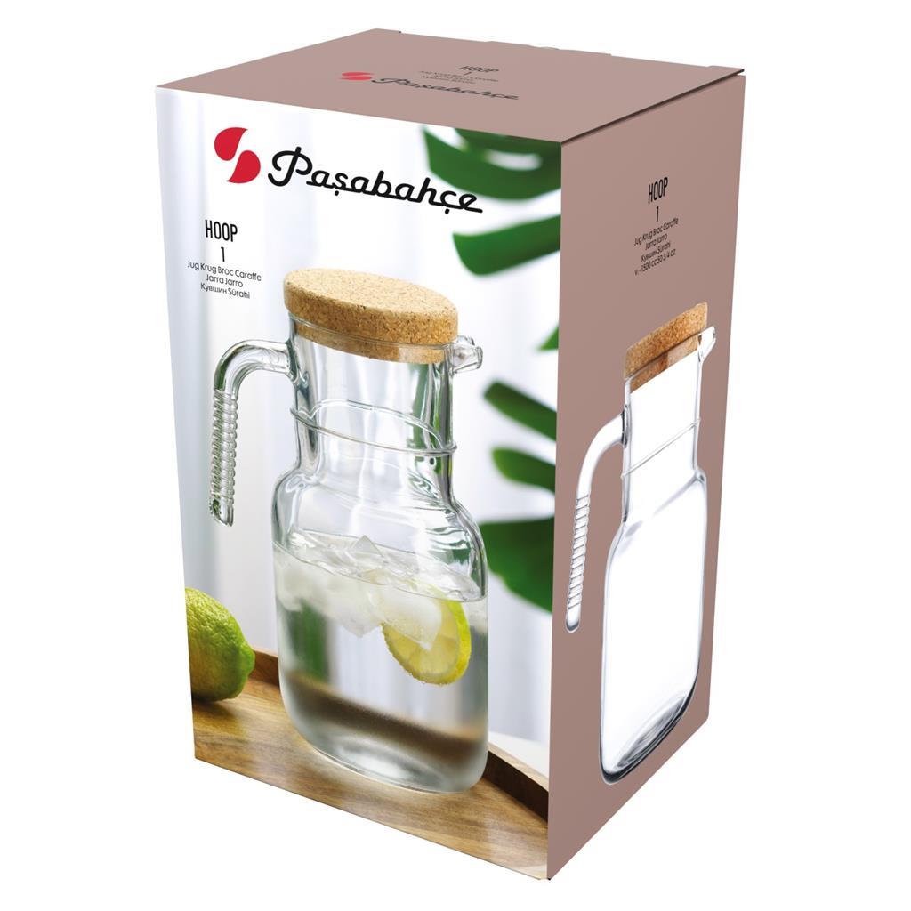 Stekleni vrč s pokrovom iz plute za vodo sok in alkoholne pijače, inovativne oblike in kvalitetne izdelave iz debelejšega stekla, linije Hoop, bo poskrbel, da bo vaša postrežba izstopala.