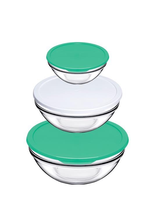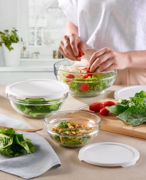 Steklena skleda s plastičnim pokrovom primerna za pripravo, shranjevanje in postrežbo hrane bo zagotovo postala vaš najljubši spremljevalec vsake priprave ali postrežbe hrane. Odebeljen rob steklenih skled omogoča, da jih brez problema nalagamo eno na drugo, brez da bi se sklede nagibale levo ali desno.