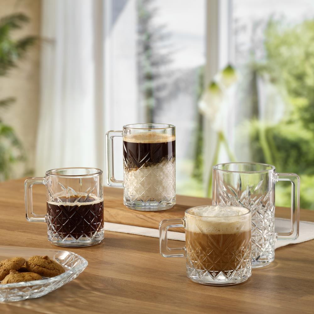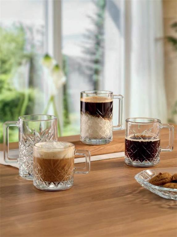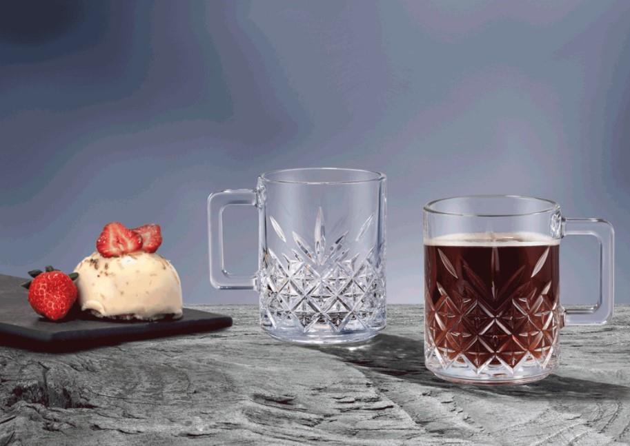 Lonček za tople napitke iz linije Timeless, bo zagotovo osvežil vašo postrežbo. Značilna retro, lomljena oblika stekla zelo lepo poudarja vsebino kozarca, zaradi tega bo pijača izgledala še toliko bolje.