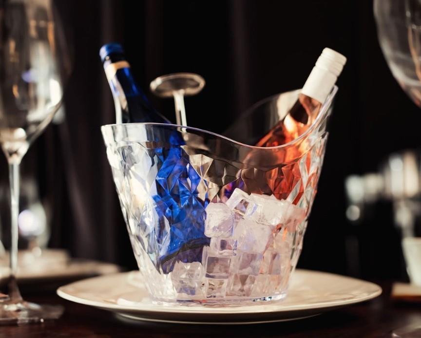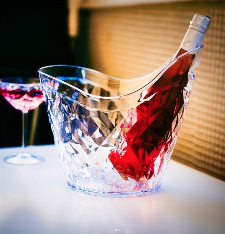 Posoda za vino za hlajenje steklenic. Narejena iz vzdržljive plastike, z vrezanima ročajema za lažje prenašanje.