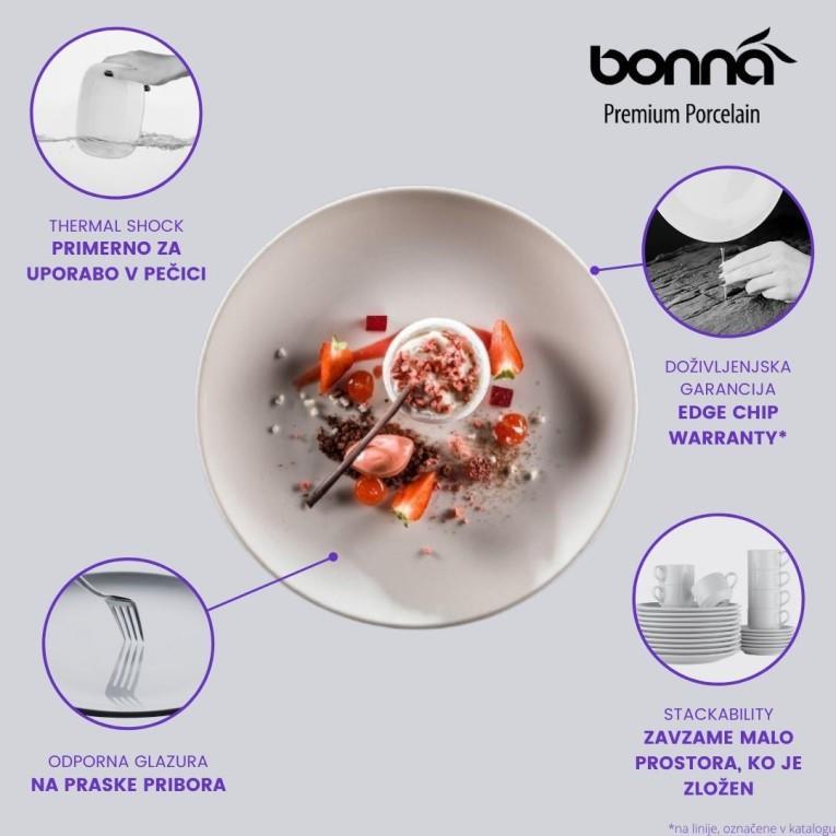 Znamka premium porcelana BONNA je bila ustanovljena z namenom zagotavljanja inovativnih produktov in rešitev za profesionalne (HoReCa) uporabnike, s svojo pestro zgodovino pa je sama znamka plod več kot 40ih let izkušenj. V prvi vrsti si proizvajalec z znamko Bonna prizadeva ugoditi potrebam sedanjosti, brez da bi s tem dodatno ogrožal prihodnje generacije. Že sama kvaliteta njihovih proizvodov stremi k dolgotrajnejši uporabi in s tem pripomore pri trajnostnemu razvoju.