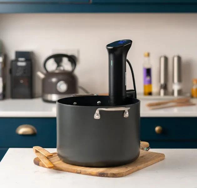 Sous vide kuhalnik za počasno kuhanje, ki ustreza standardu vodotesnosti IPX7. Iz varnostnih razlogov se samodejno izklopi ob odstranitvi iz vodne kopeli.